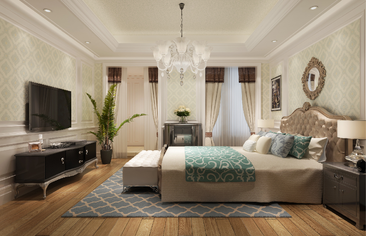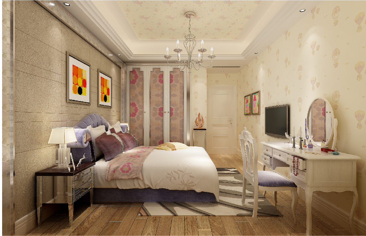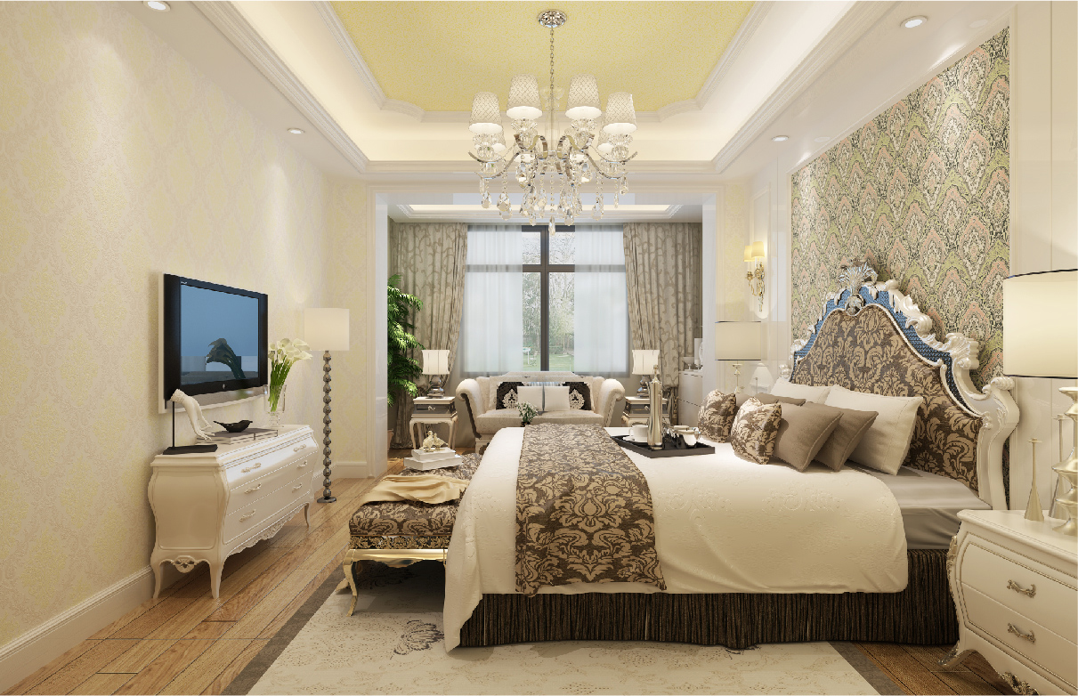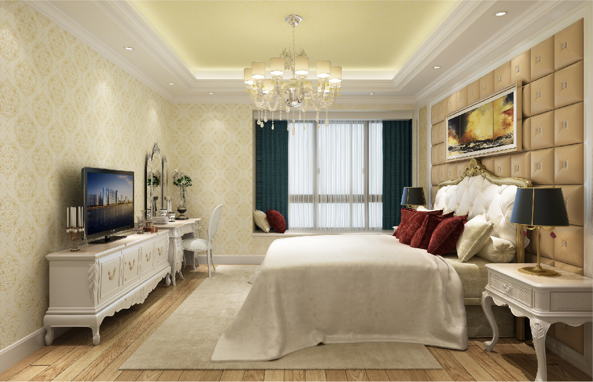 细腻柔和、色彩自然的丝网印花,衬托了造型背景墙多元素材质的应用,将房间内地面拼花砖、色彩雅质的欧式沙发、高贵的欧式床及床上用品等各种元素及颜色融合到一起。让欧式风格中深沉里显露尊贵、典雅浸透豪华的设计哲学,走进了我们的生活,满足了业主追求生活品质的愿望。