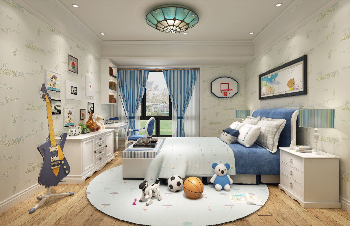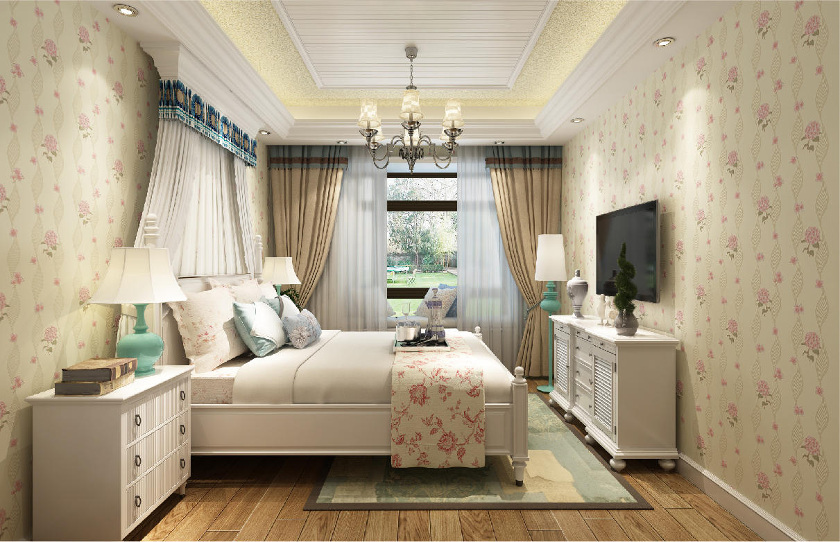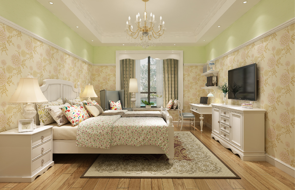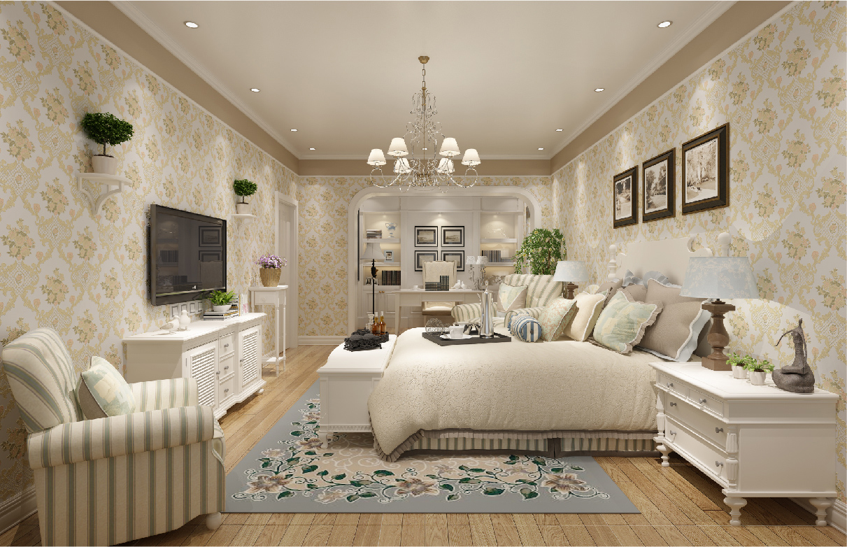 墙面取材于自然界的丝网印图案及色彩,以纯净自然的朴素带来明快清新的乡土风味,追求一种有如置身于悠闲浪漫的自然之美,烘托出房间简朴、高雅的整体氛围。