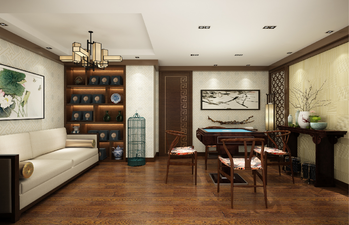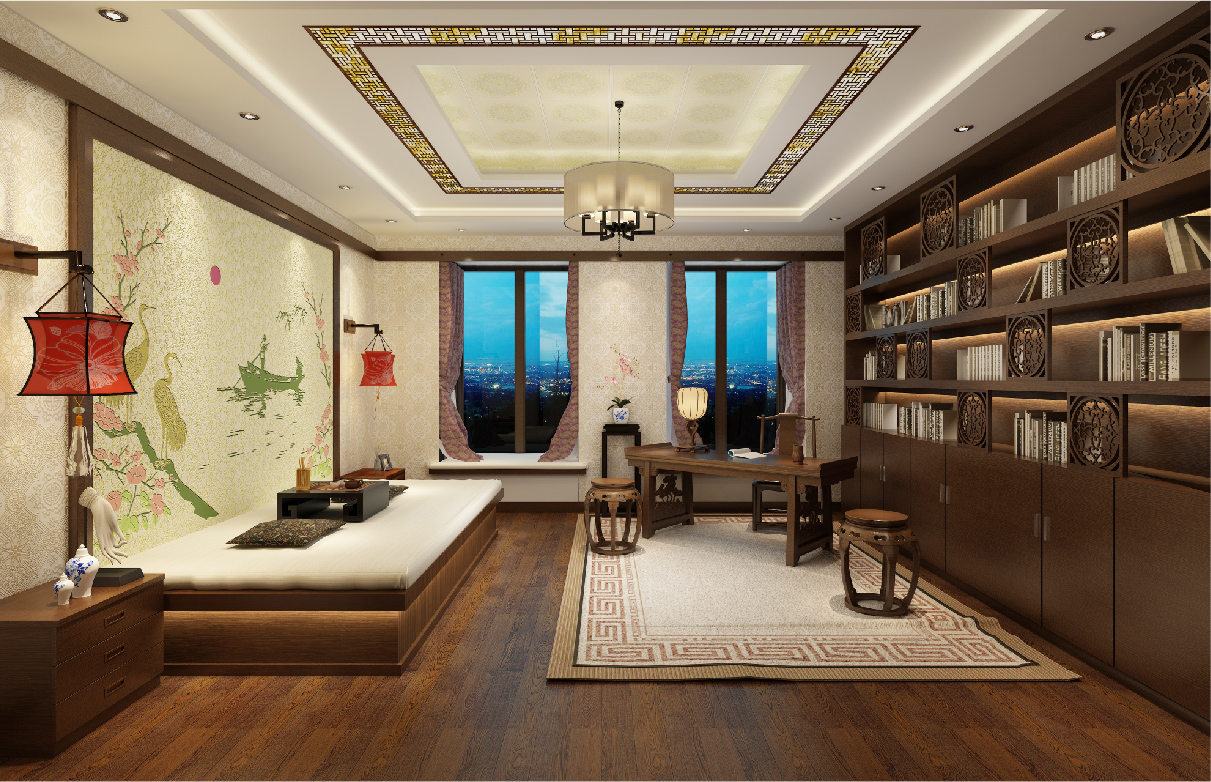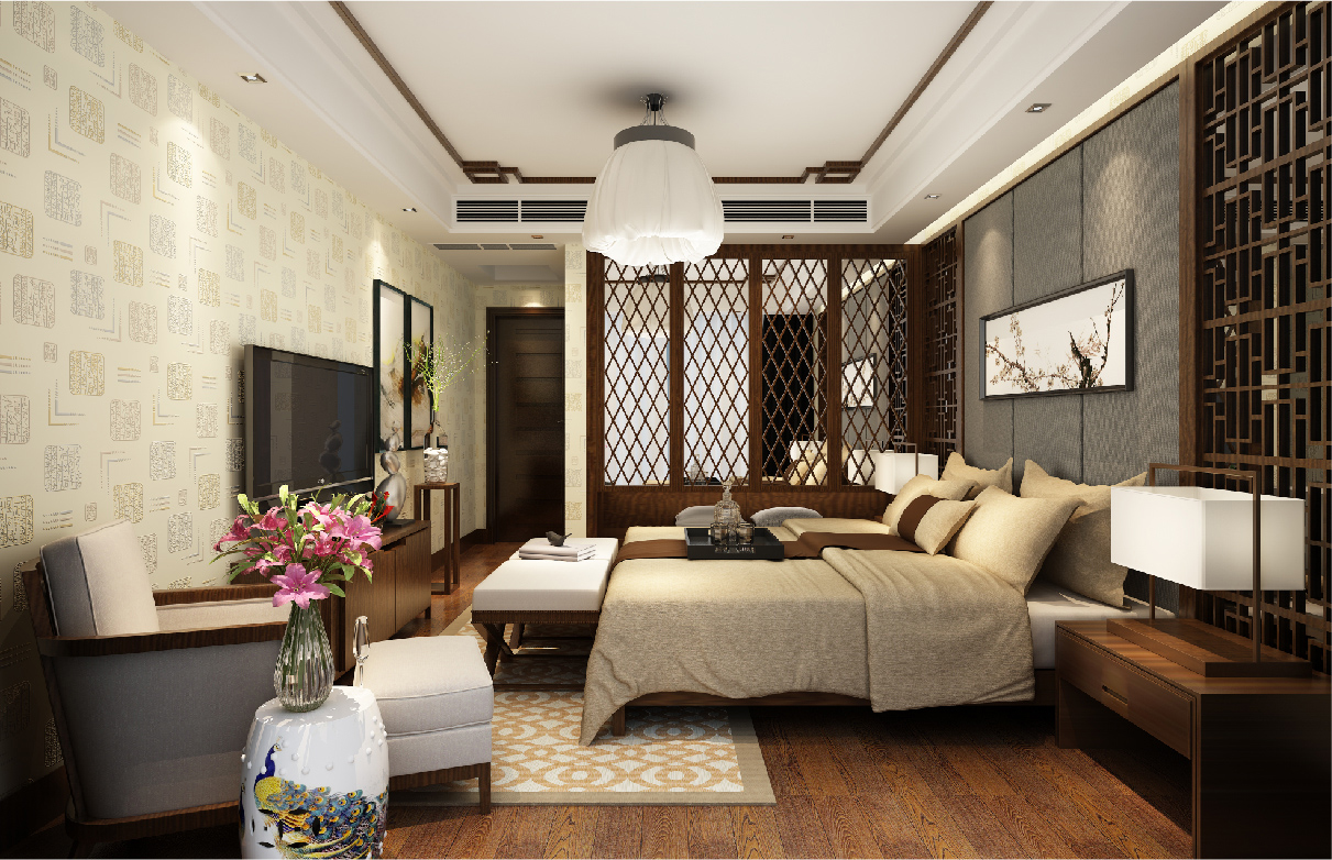 对称、方正的设计手法装饰的造型背景墙,在多元素装饰材料如:大理石、硅藻泥肌理工艺等点缀下带给人庄重而优雅。吊顶以木条相交成方格形,用实木做框,层次清晰。墙面中式文化元素的丝网印工艺,以中国传统古典文化为背景,秉承了传统古典风格的典雅和华贵,同时也呈现出时尚的特征。讲究对称陈设摆放的家具,壁挂的木雕画,古玩、字画、盆景、精致的工艺品,带来房间浓浓的文化韵味和独特风格,诠释了主人的文化涵养以及对中国传统文化的浓浓深情。