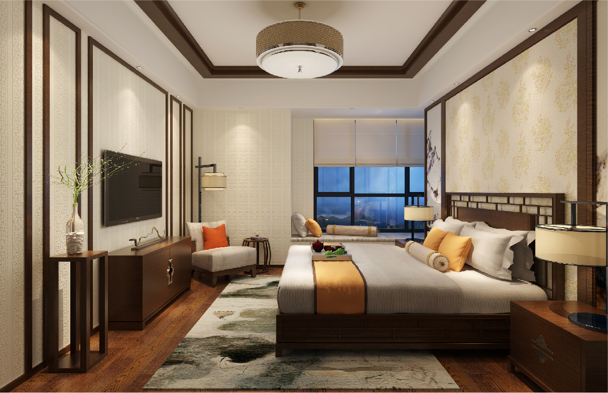 墙面中式风格的丝网印花工艺,取材于中式古典元素如:“万字格”“福字窗棂”等元素,弃繁从简,以咖色、红色为色调,新颖亮丽,打造出空间的层次感。与房间内各种中式家具、对称式的造型处理、窗花、中式字画等,营造出追求内敛质朴的中式家居品味,体现出主人清雅含蓄、端庄丰华的意蕴境界。