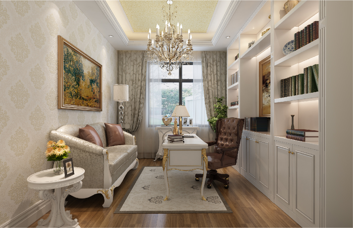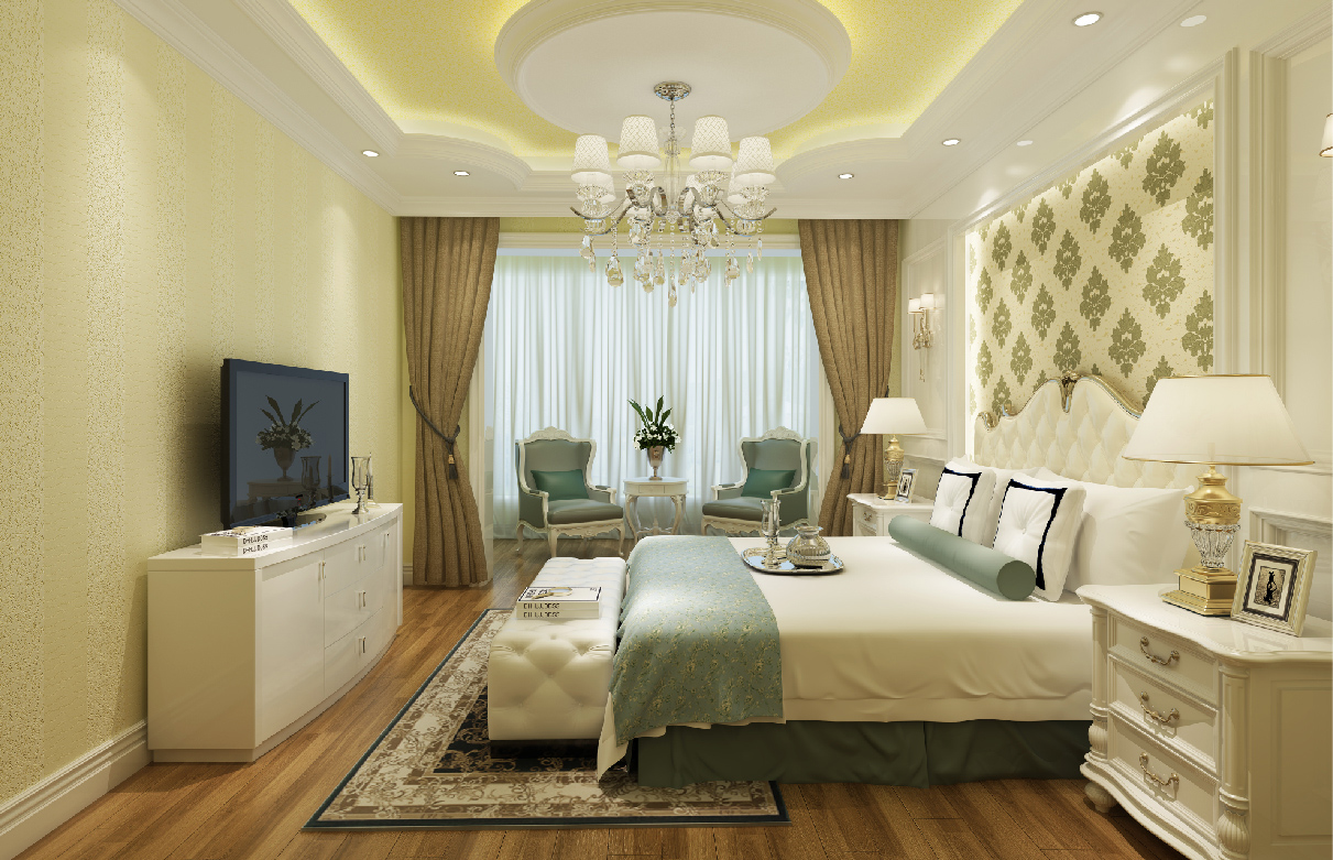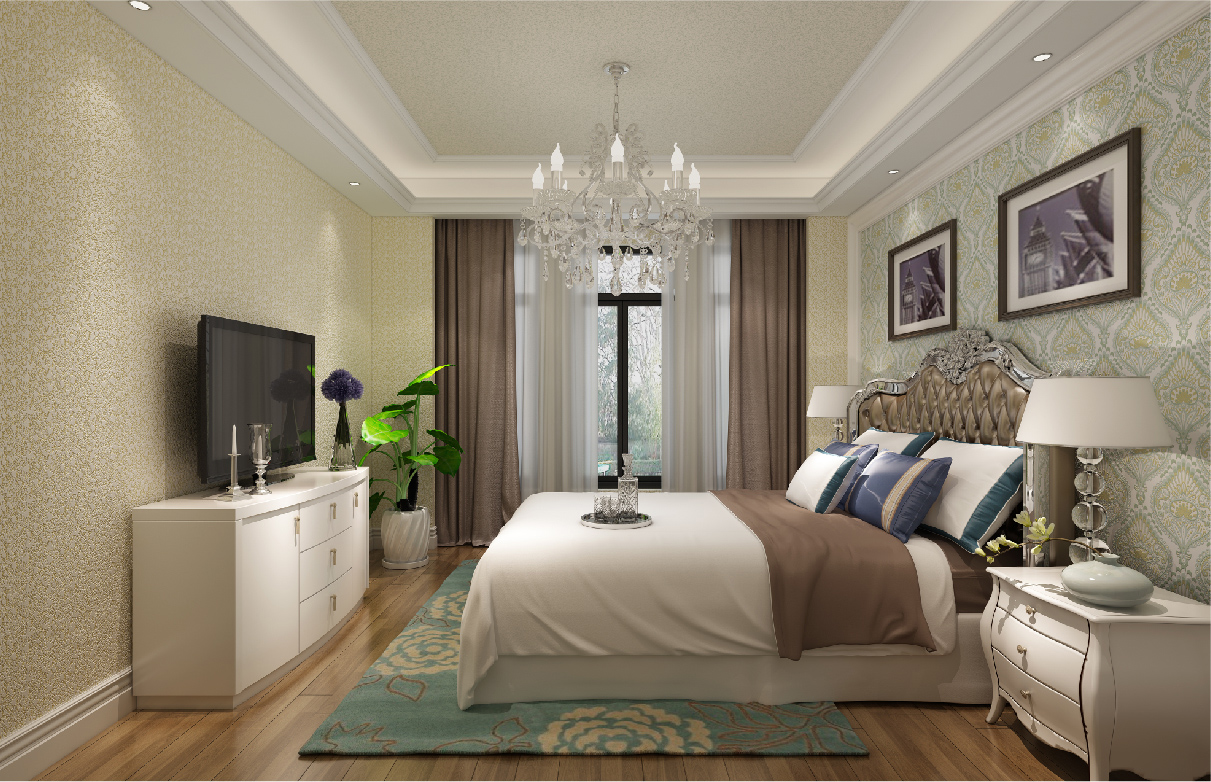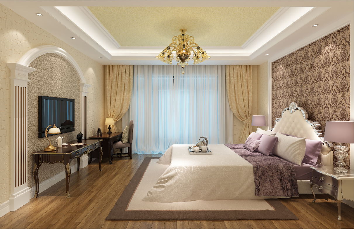 线条简洁的背景造型墙面配与深色系的丝网印花,表现出欧式风格的华贵气质。造型古朴的吊顶使整个空间看起来富有韵律感且大方典雅。宽大精美的家具,配以精致的雕刻,墙面同一颜色的肌理工艺,为整个空间带来了柔美的气质,给人以开放、宽容的非凡气度。同时也满足了业主希望将上海浦江边欧风建筑的味道融入新居的愿望。