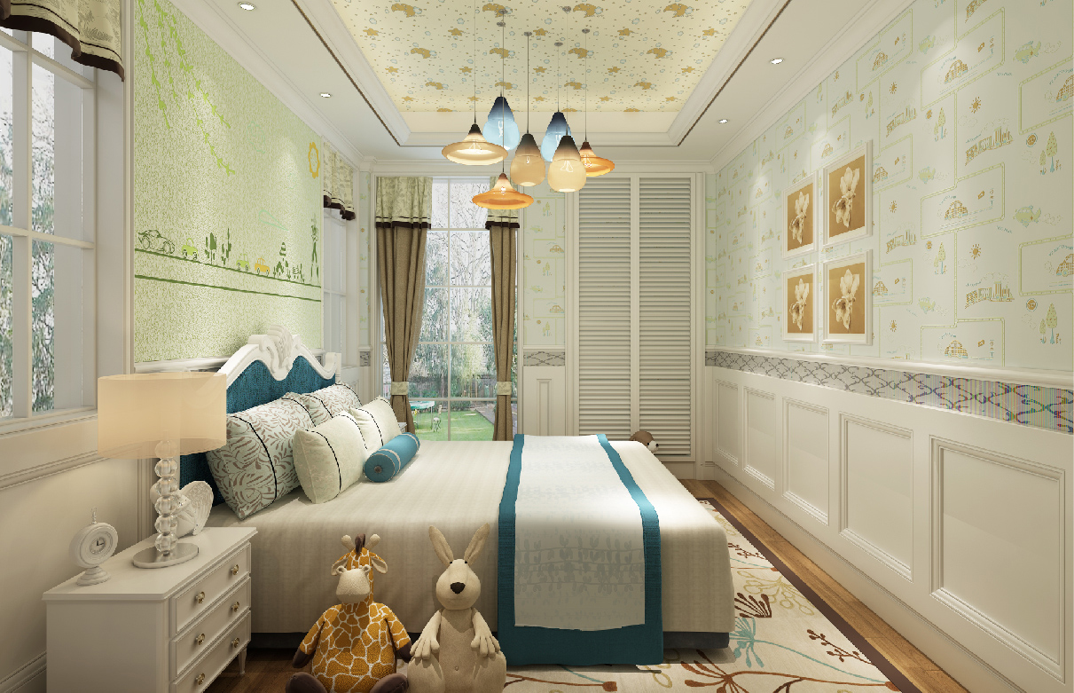 墙面米黄色的肌理图案,既与房间内简洁大气的造型处理、洁白的柜子、色彩明艳的布艺沙发相融合,又烘托出欧式风格的豪华效果。造型背景内深色系的丝网印花,表现出欧风的华贵气质,创造出轻松、明朗、亲切的空间环境。