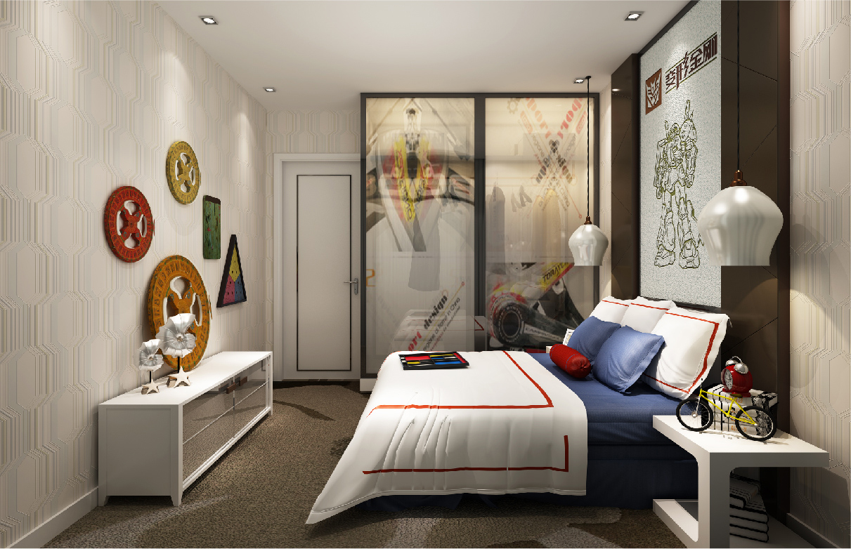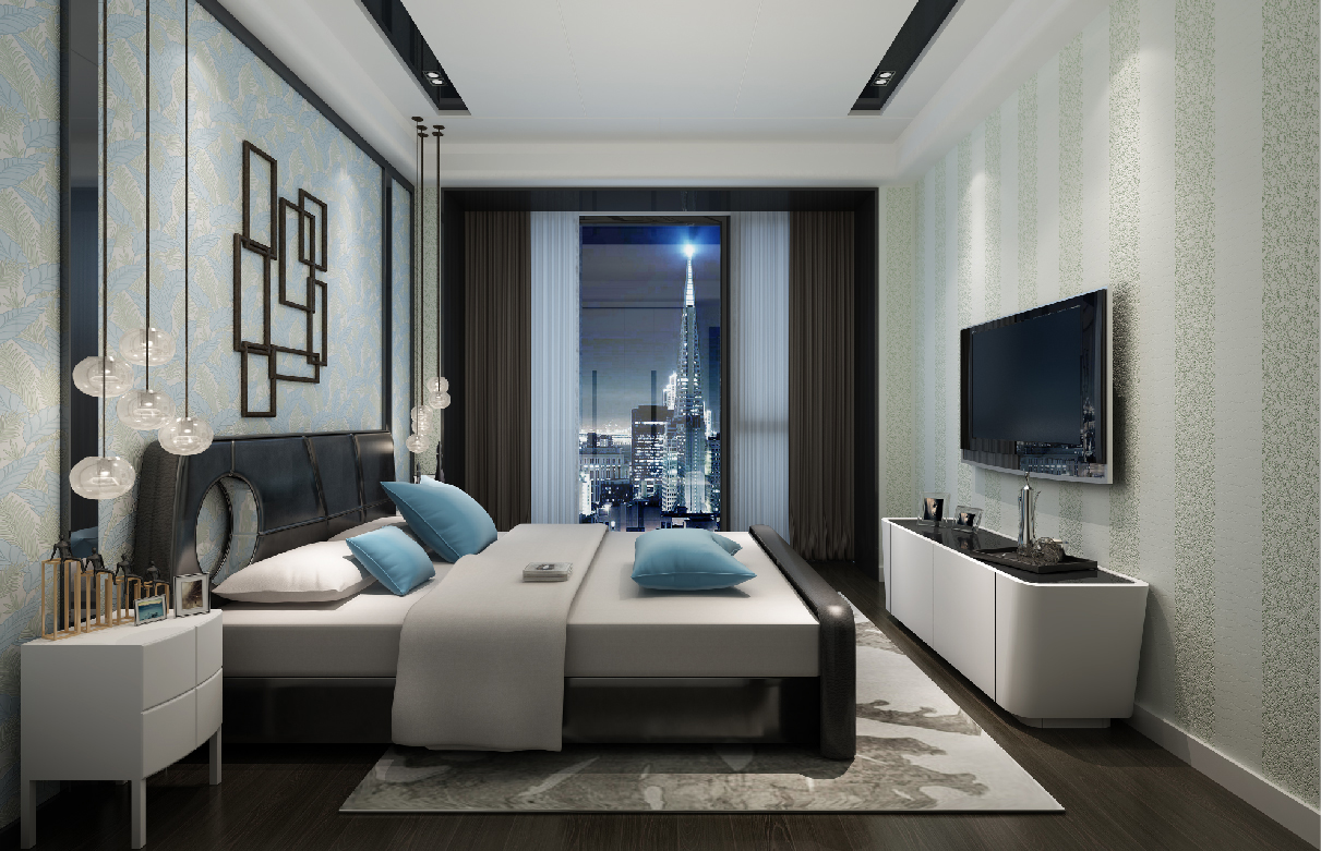 造型背景墙内丝网印工艺采用各种不同的设计手法,如曲线与非对称线条等等,以及强烈的色彩对比,让整个墙面以简洁的视觉效果营造出时尚、前卫的感觉。墙面以自然元素呈现的肌理工艺,做为房间的主色调,营造出简洁明快的效果。