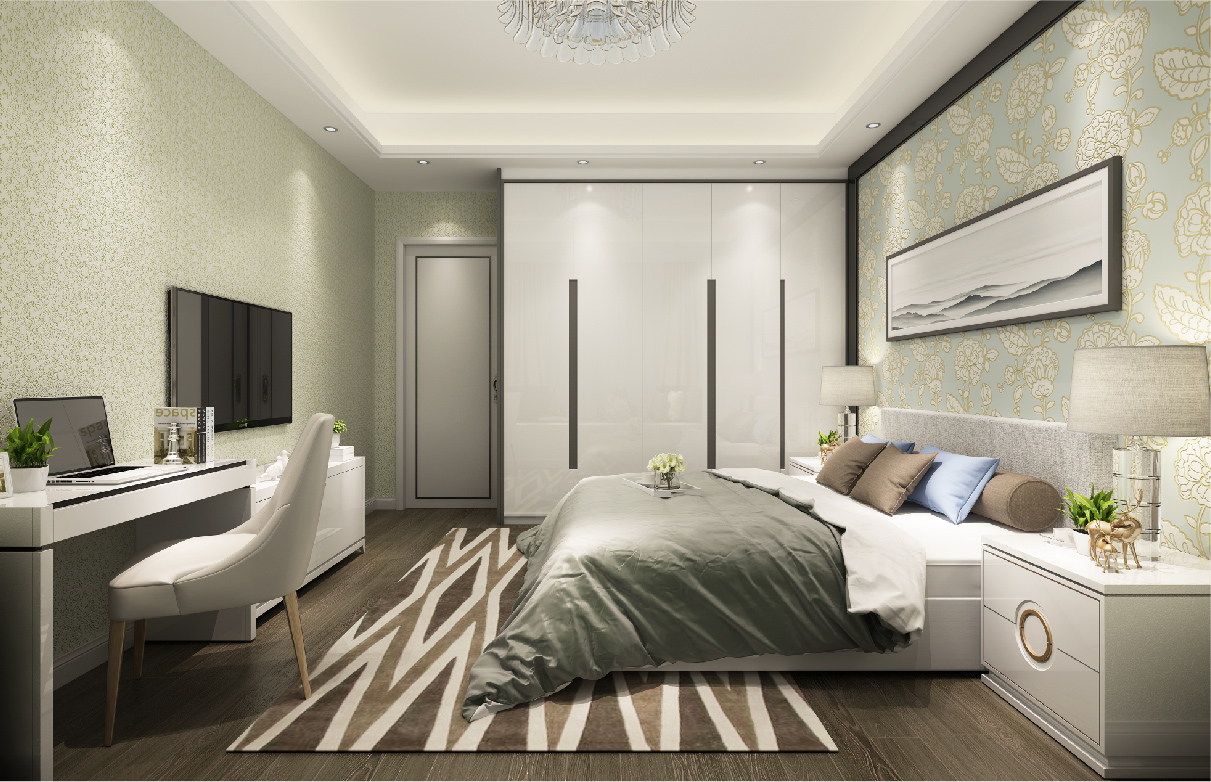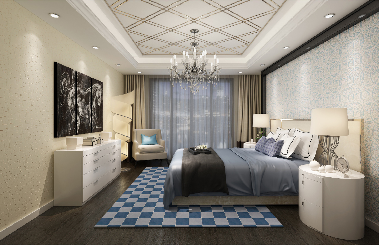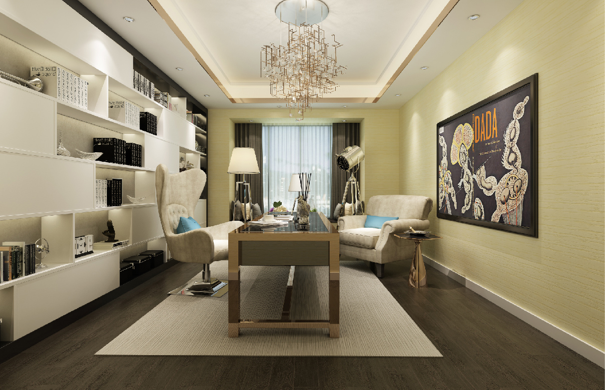 简洁、大方的造型边框在丝网印工艺细腻柔和的色彩点缀下,让整个墙面简洁而不简单,带给人前卫、不受拘束的感觉。墙面以自然元素呈现的肌理工艺,纹理清晰而随性,注重与房间内整体色调的和谐统一。而房间内艳丽的布艺沙发,干净整洁的斜铺拼花地板,线条流畅的吊顶造型等元素以少胜多、以简胜繁,以色彩的高度凝练和造型的极度简洁,在满足功能需要的前提下,将空间、物进行合理精致的组合,展示出最丰富动人的空间效果。描绘出业主对整个房间独特的品味追求。
