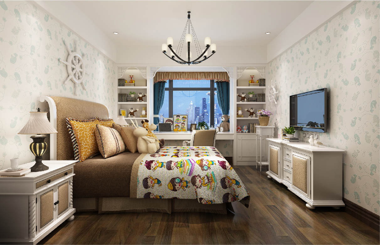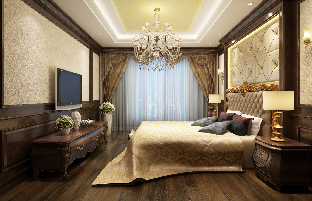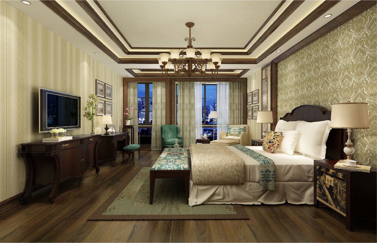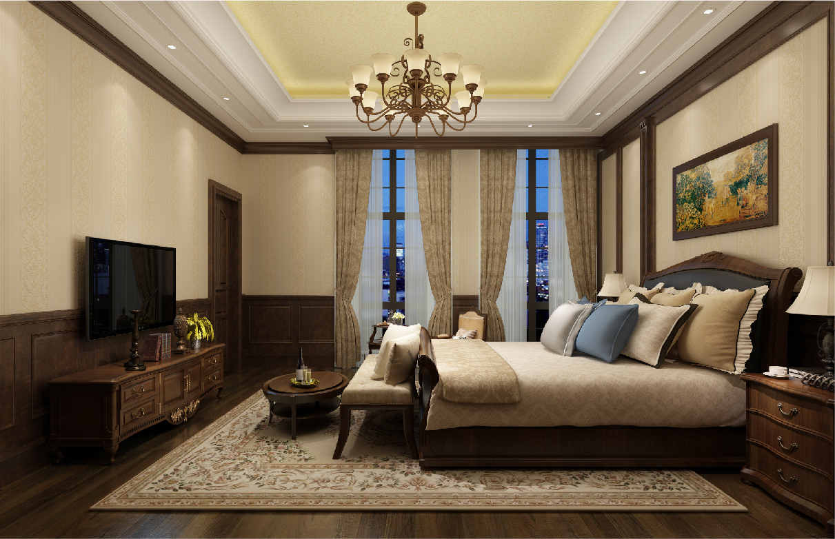 房间内各墙面造型采用护墙板做为装饰点缀,纹理清晰,显现木材本色,让整个空间立体感强烈,“回归自然”,营造了一种自然、怀旧的生活。沙发、酒柜、床等各种家具保留着与墙面协调统一的色调,一方面保留了材质、色彩的大致风格,又有自身独特的元素,如:模仿动物形状的家具脚腿造型,精致的小五金及雕饰点缀,华丽而庄重的镶嵌线处理等等。吊顶的处理强调一种居家自然的风格,与墙面造型上和谐统一。墙面丝网印工艺,细腻柔和,注重色彩上的搭配统一,以一种优雅、唯美的姿态,平和而富有内涵的气韵,将整个房间打造出一种独特的文化底蕴,与房间主人对生活的需求相结合,营造出一种温馨舒适的家居环境。